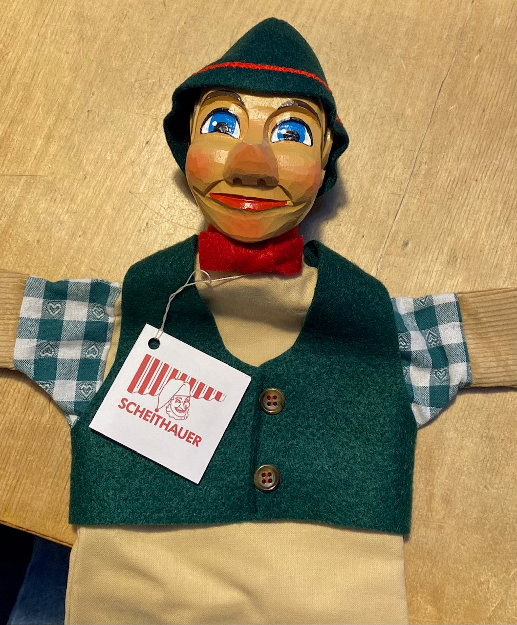 Handgeschnitzt und handgemalt, in der Tradition der Hohnsteiner Kasperfiguren. Deutsches Kunsthandwerk.